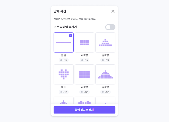 스페이스 내에 이용자들을 원하는 모양(삼각형, 하트, 사각형, 트리)으로 배치할 수 있습니다.