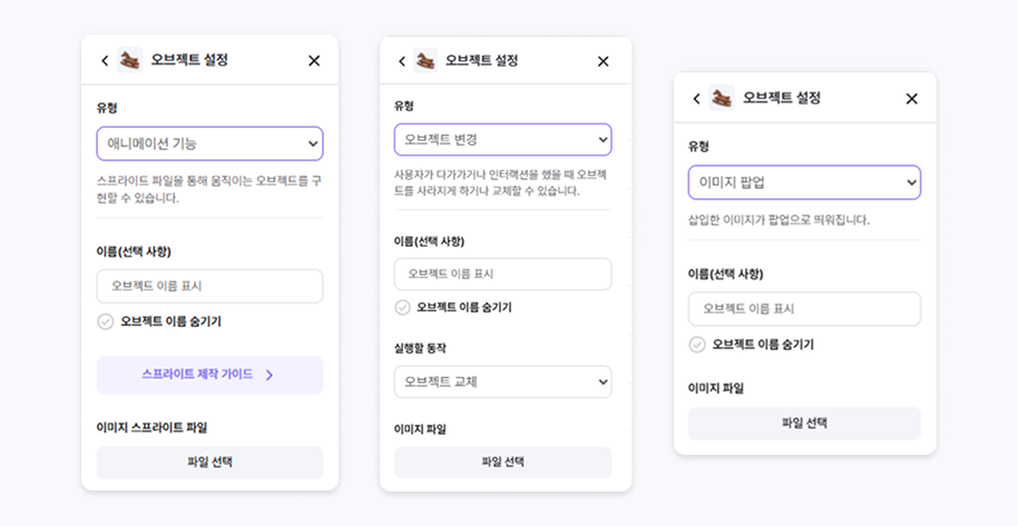 오브젝트 설정 → (1) 애니메이션 기능 , (2) 오브젝트 변경 → 오브젝트 교체, (3) 이미지 팝업