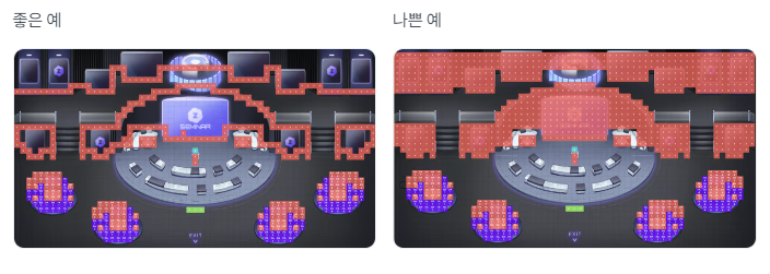 통과 불가 타일은 불필요한 부분을 제외하고 경계에만 설치하는 것을 추천 드리며, 대각선 방향이 비어있는 경우 이동이 가능하니 계단 형태로 설치하는 것을 권장합니다.