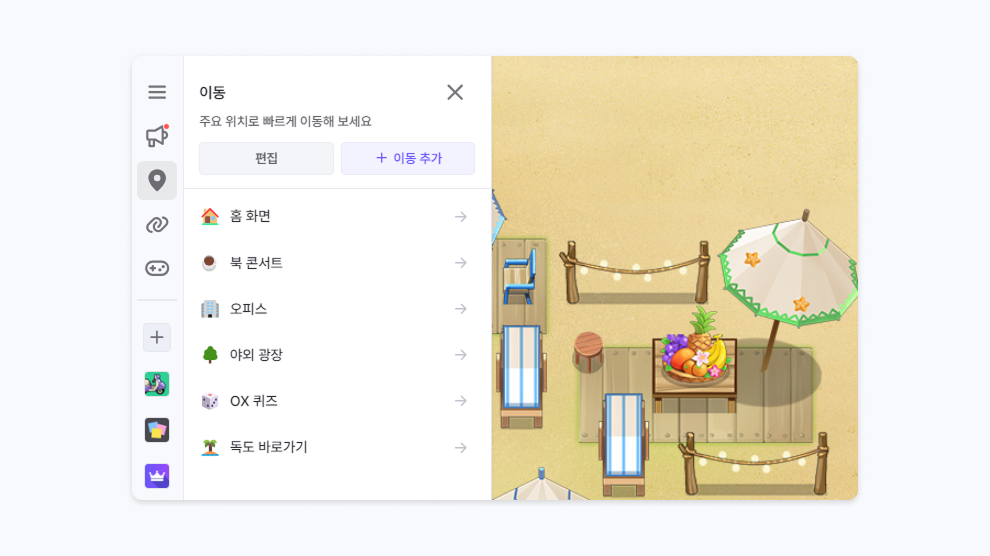 사이드 바 아이콘 노출: 호스트가 설정해둔 이동 및 링크 기능이 사이드 바에 아이콘으로 노출됩니다.