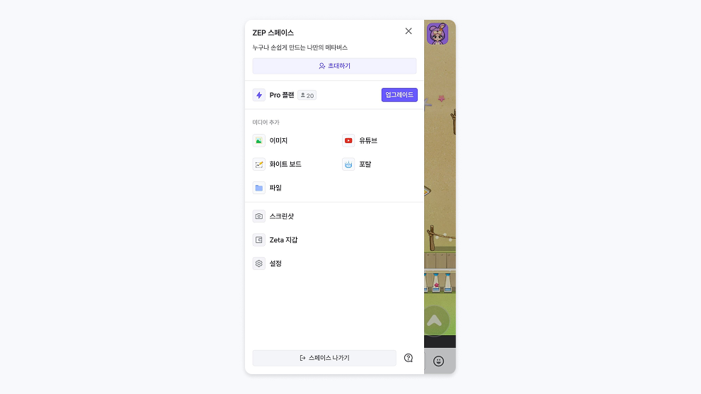 햄버거 메뉴를 클릭하면 스페이스 정보, 초대링크 복사, 업그레이드, 채널, 미디어 추가 등의 기능을 사용할 수 있습니다.