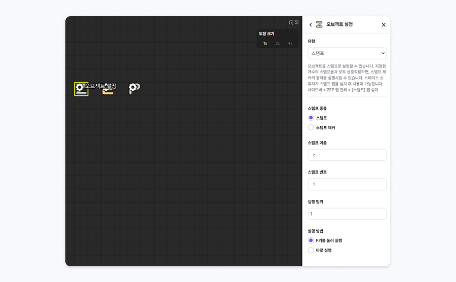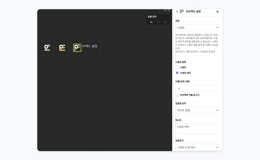 [맵 에디터] > [오브젝트/상단 오브젝트] > [오브젝트 설정] > [스탬프]에서 스탬프 기능을 활성화하세요.