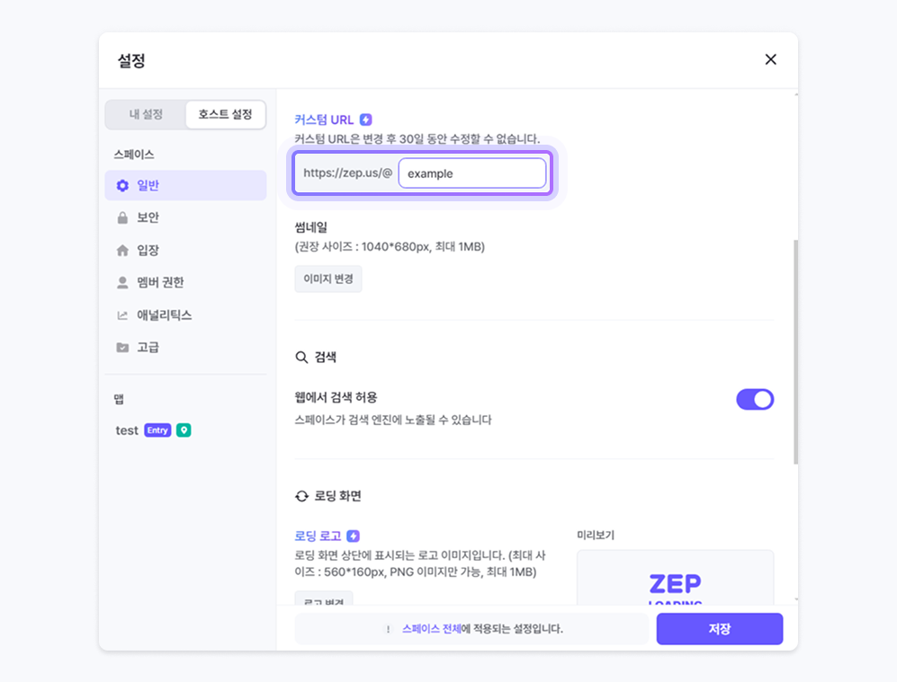 URL을 변경하고자 하는 스페이스에서 호스트 설정 >일반 설정 > 커스텀 URL 부분 항목에 URL을 입력한 후 저장을 클릭합니다.