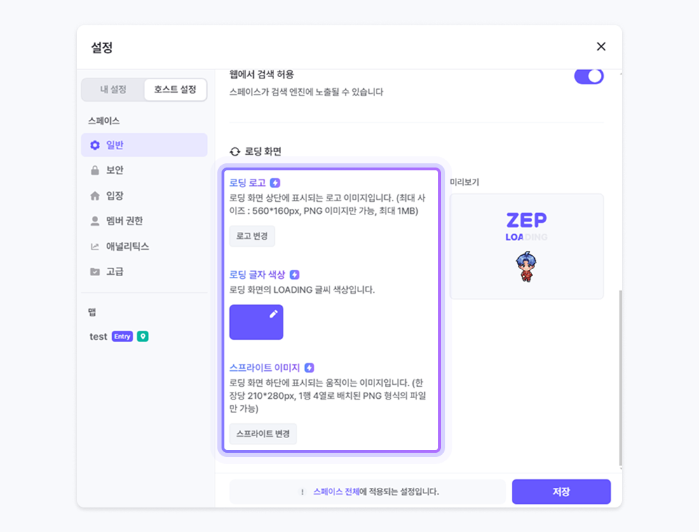 사이드바 > 스페이스 설정 > 고급 설정 > 로딩 화면