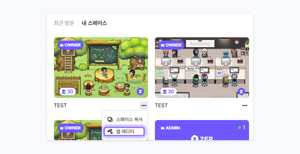 홈 > 내 스페이스 에서 스페이스 명 옆의 점 세 개를 눌러 맵 에디터에 접속해 주세요.