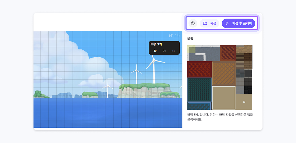 에디터 오른쪽 상단의 [저장] [저장 후 플레이] 버튼으로 만든 맵을 저장 후 플레이 해보세요.