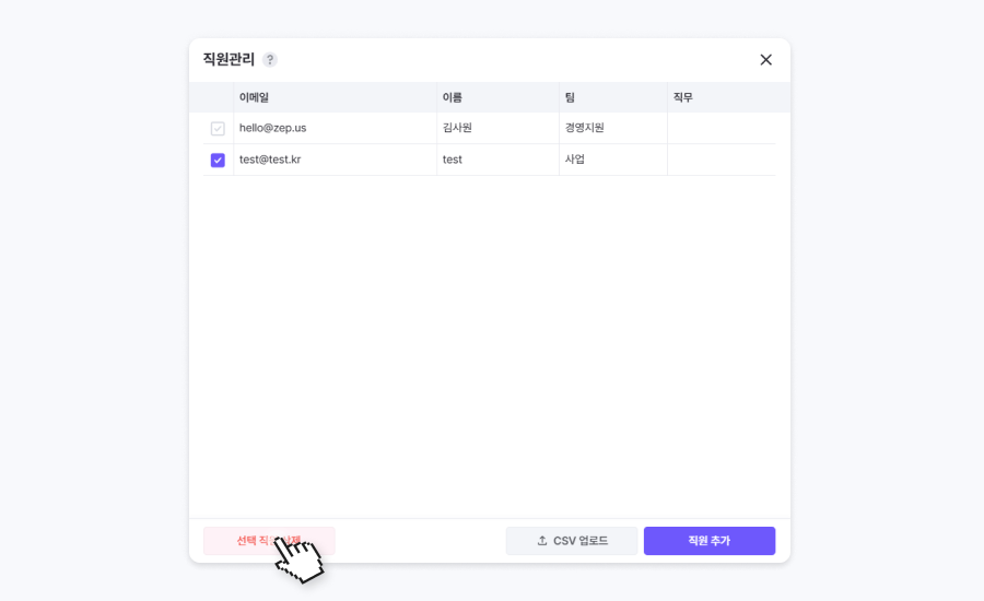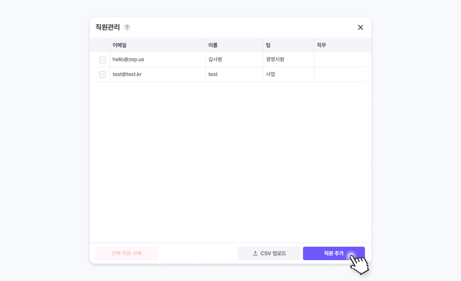 직원 관리 목록의 [CSV 업로드]를 클릭하여 저장한 CSV 파일을 추가합니다.