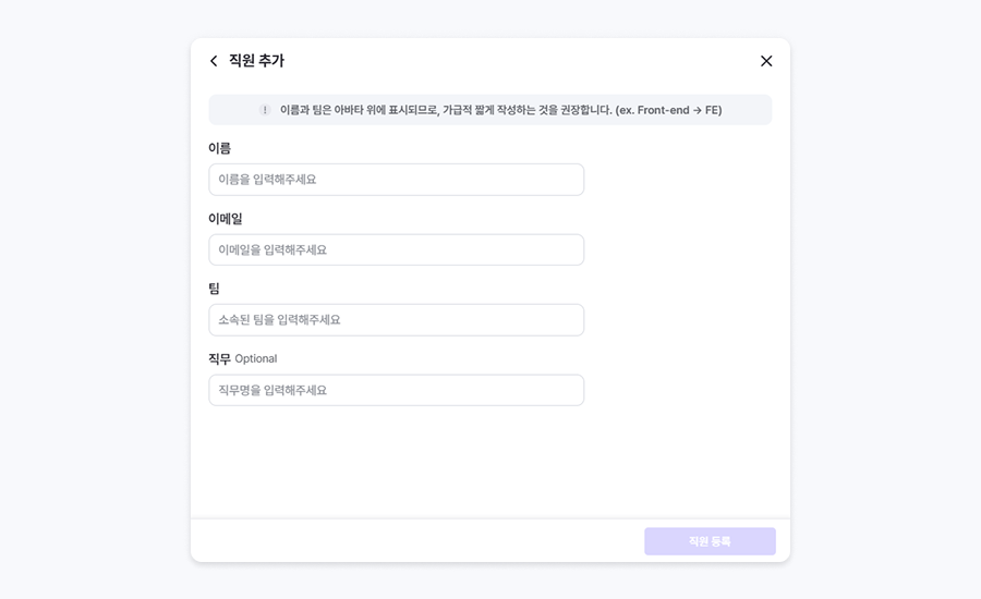 직원 추가를 클릭하여 직원을 추가합니다.이름 / 이메일 / 팀 이름을 적고, 직원을 등록합니다.