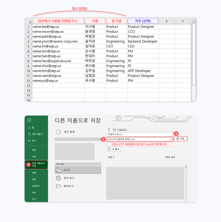 엑셀 또는 스프레드 시트에 ZEP에서 사용할 이메일 주소 / 이름 / 팀 이름을 순서대로 적습니다.