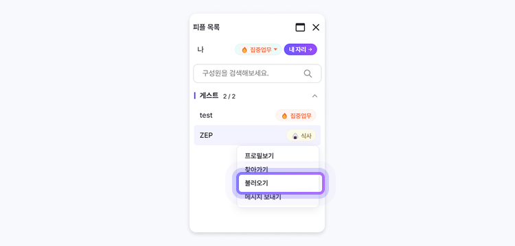 피플목록에서 대상을 선택하면, 불러오기가 표시됩니다.