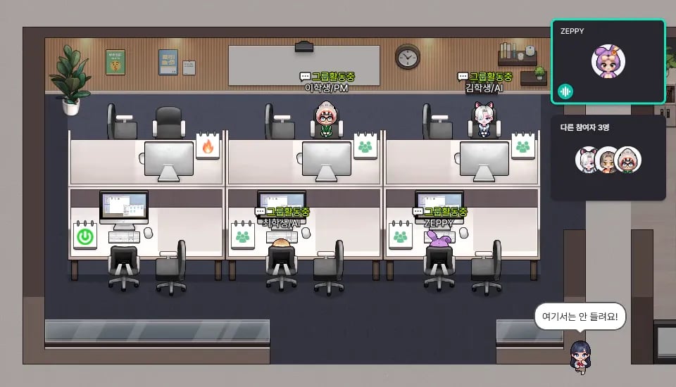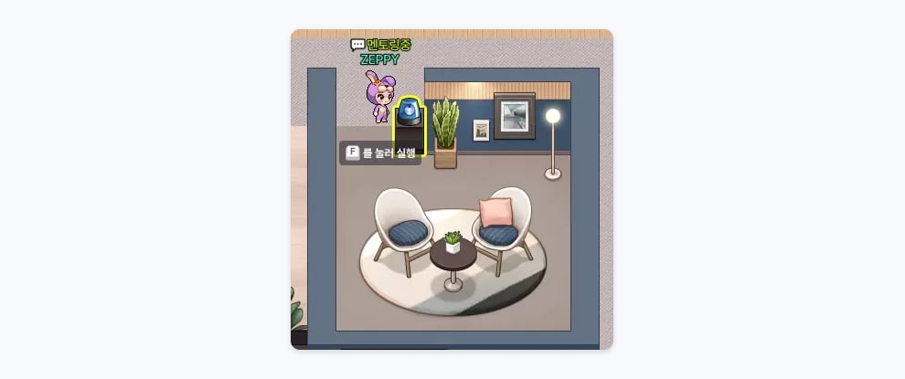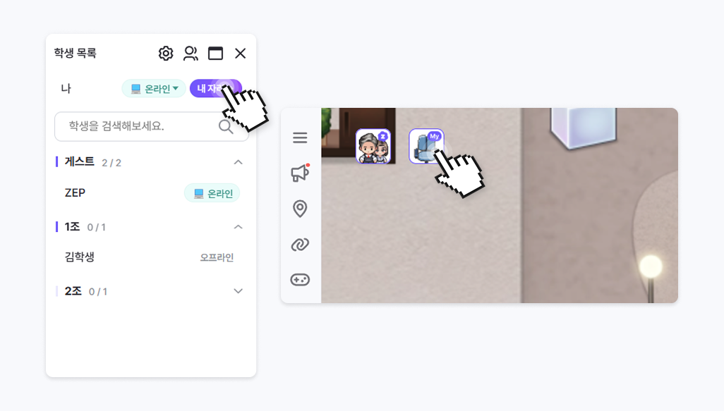 빈자리에 설치된 ‘출석 오브젝트’ 혹은 ‘호출 오브젝트’와 [F]키로 상호 작용하여 자리를 지정할 수 있습니다.