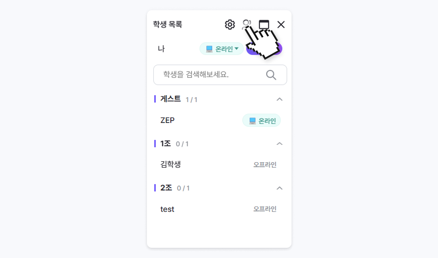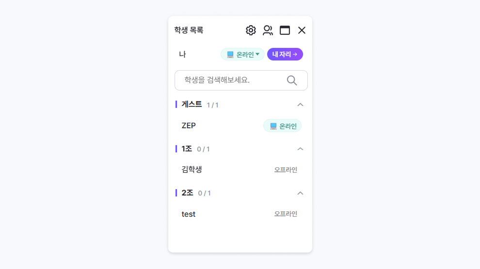 그룹 별로 학생 조회가 가능하며, 접속 인원 및 팀 인원을 목록에서 확인할 수 있어요