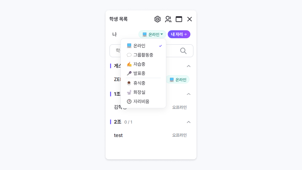 교실에 들어가면 수업 중으로 표시됩니다. 단상 위에 올라가면 발표 중으로 표시가 변경되며, 교실이 아닌 다른 장소에서도 발표 중이라면 상태 값을 변경할 수 있습니다.