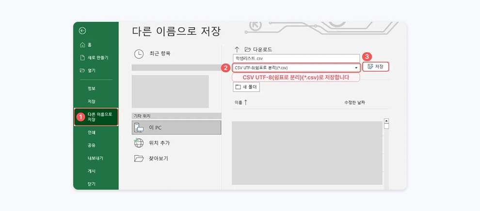 [다른 이름으로 저장] - 파일 형식을 [CSV UTF-8(쉼표로 분리)(*.csv)]로 지정 - [저장]