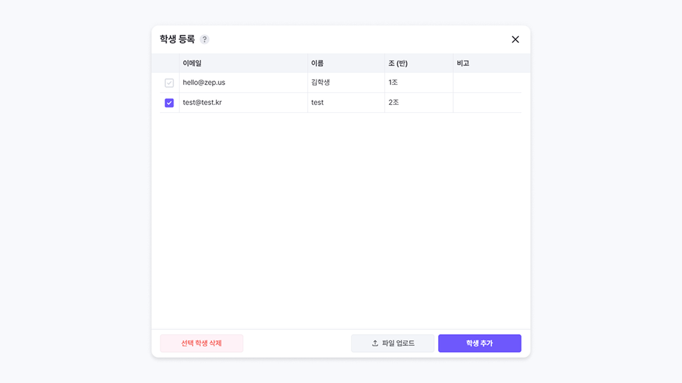 학생 추가를 클릭하여 학생을 추가합니다.이름 / 이메일 / 조(반) 이름을 적고, 학생을 등록합니다.