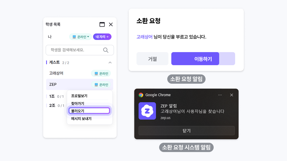 학생 목록에서 대상을 선택하면 찾아가기가 표시됩니다. 클릭 시, 해당 멤버 위치로 이동 됩니다