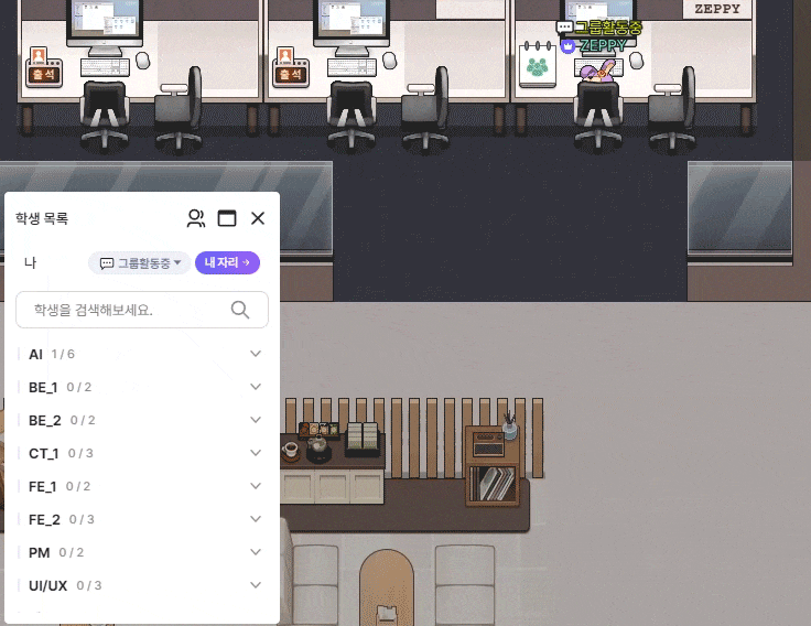 학생 목록과 동시에 학생들이 무엇을 하고 있는지 자리 기반으로 확인이 가능합니다.