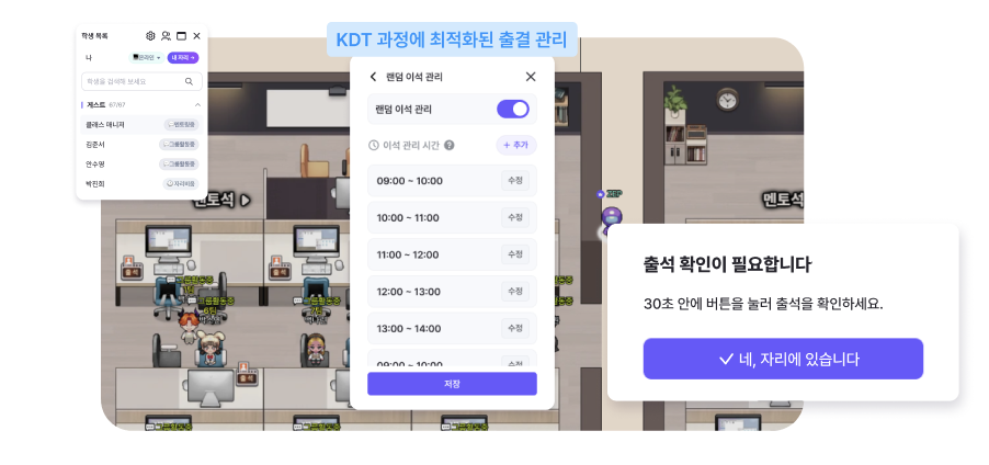 스페이스 공간에서 학생들이 학습 중일 때, 이석 체크를 위해 불시 점검 팝업을 띄울 수 있습니다.