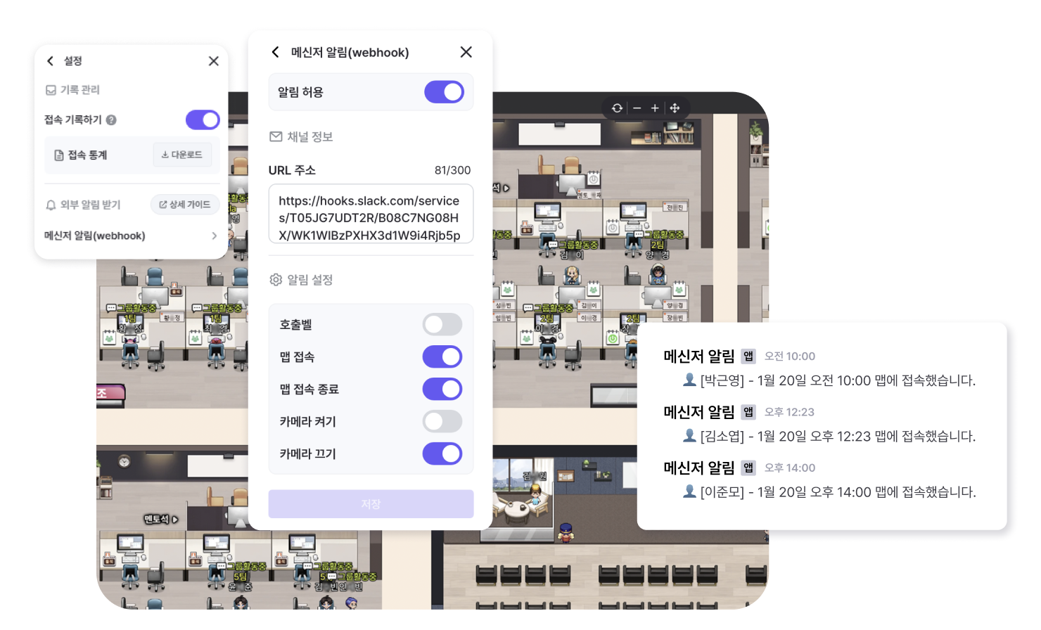 맵에 접속해 있는 로그인 한 유저의 카메라 on/off 상태가 메세지로 전달 됩니다.