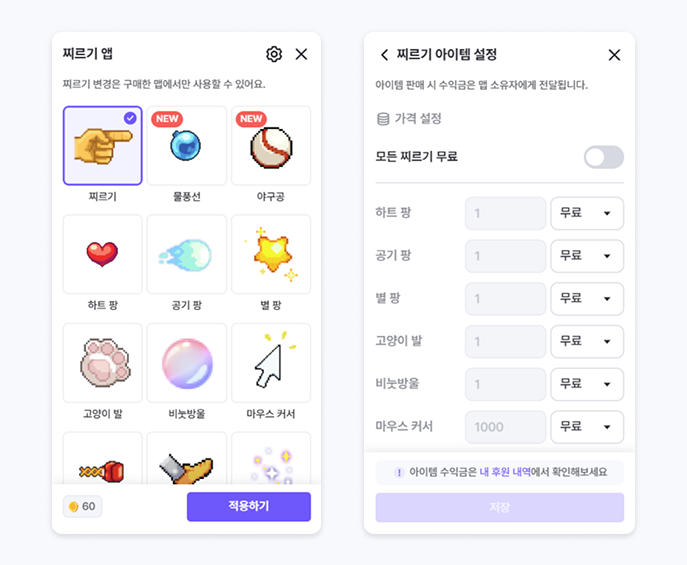 찌르기 앱 (ALL) : 스페이스 소유자용으로 찌르기 아이템 구입 적용 시 스페이스에 참가한 모든 이용자의 찌르기 모양이 변경됩니다. 일부 찌르기들은 사운드도 함께 변경됩니다.(에셋스토어)