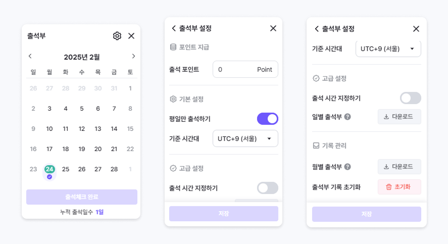 관리자는 출석부 설정에서 출석 포인트와 기준 시간대를 설정할 수 있습니다.