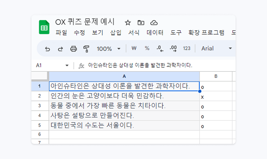 A열에 문제를 입력하고 B열에 정답을 입력해 주세요.