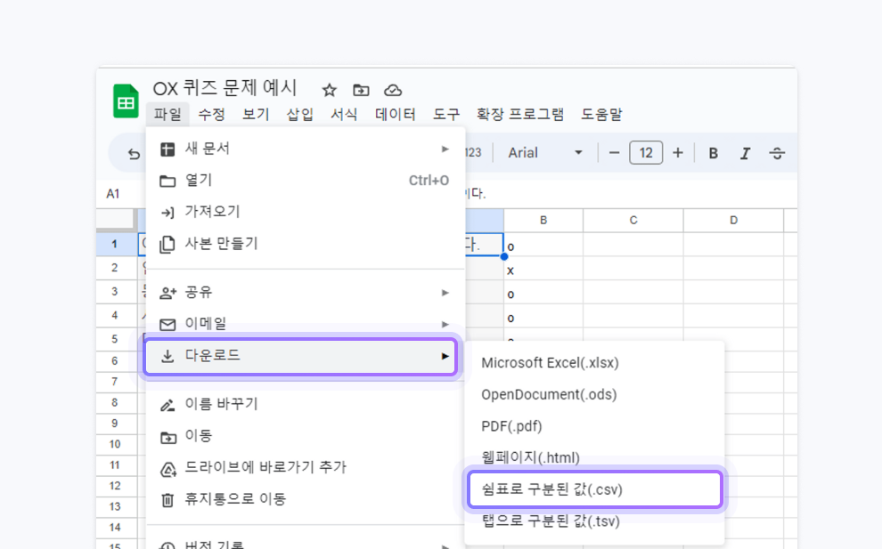 문제를 기입한 후 파일 > 다운로드 > 쉼표로 구분된 값(.csv) 파일 형식으로 다운로드해 주세요.