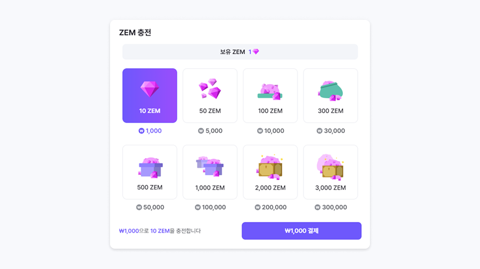 ZEP 의 유료 재화 ZEM 을 충전할 수 있는 충전 페이지가 열립니다.