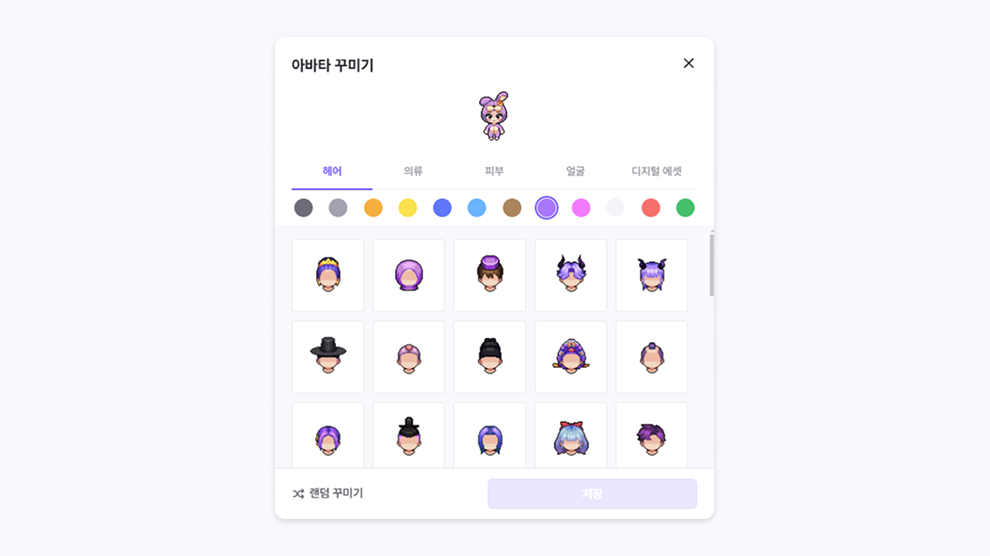 아바타 꾸미기 창에서는 아바타를 꾸밀 수 있습니다.