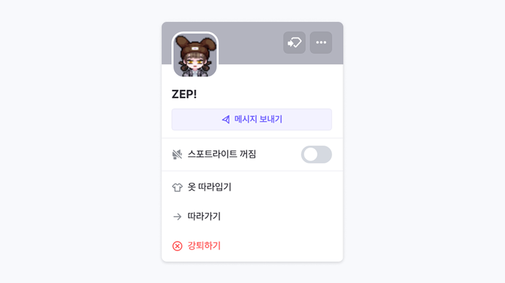 원하는 스타일의 옷을 입고 있는 참가자가 있다면, 상대 프로필 창에서 옷 따라입기를 클릭해보세요.