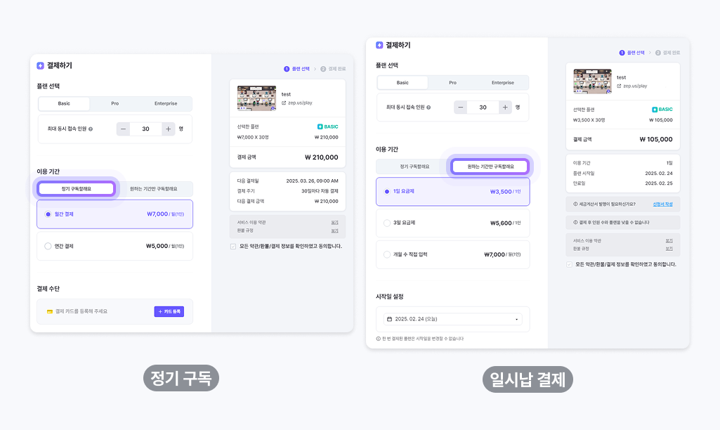이용 플랜, 최대 동시 접속 인원, 이용 기간, 결제 수단을 선택 후 결제하기를 눌러주세요.