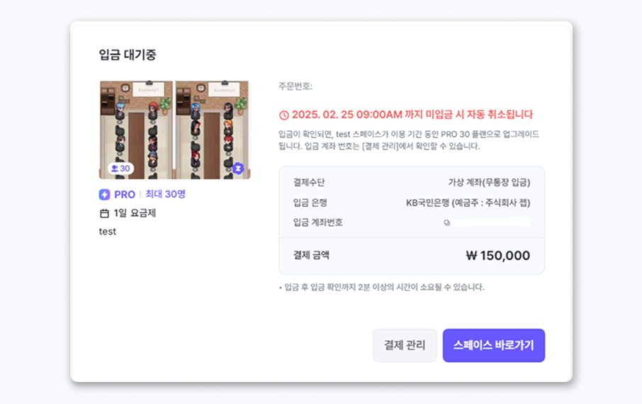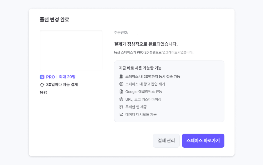 결제가 완료된 후, 바로 해당 스페이스에 플랜이 적용됩니다.