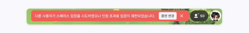 정원이 초과된 스페이스의 소유자와 관리자에게 새로운 유저가 접속을 시도할 시 화면 상단에 알림이 노출됩니다.