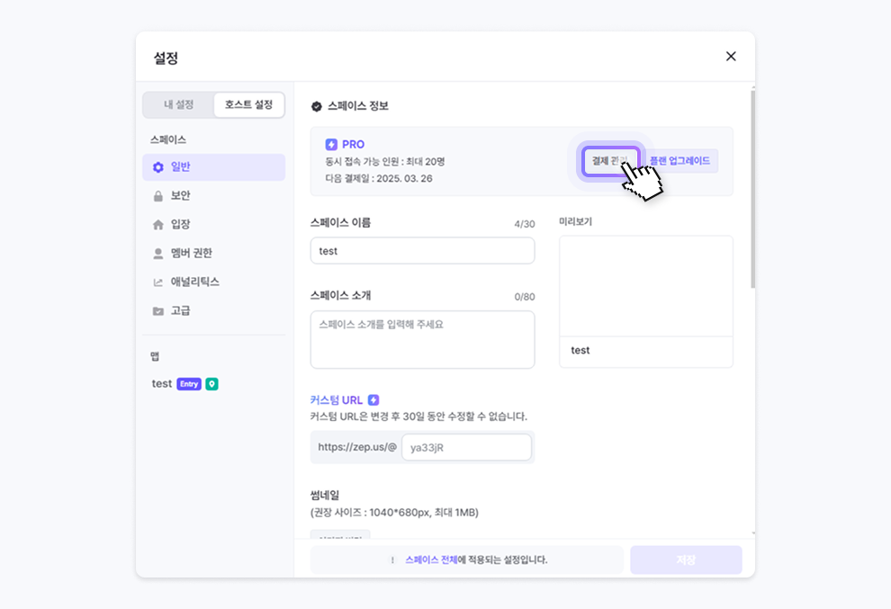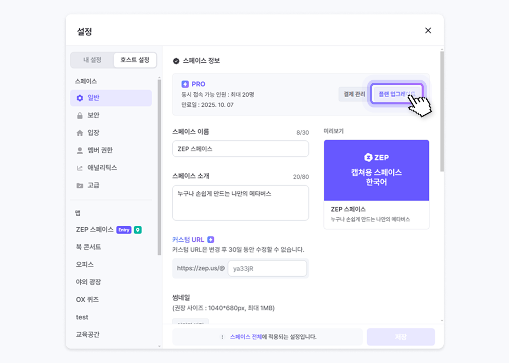 업그레이드를 원하는 스페이스의 호스트 설정에서 [일반] > 스페이스 정보 > [플랜 업그레이드] 버튼을 눌러주세요.