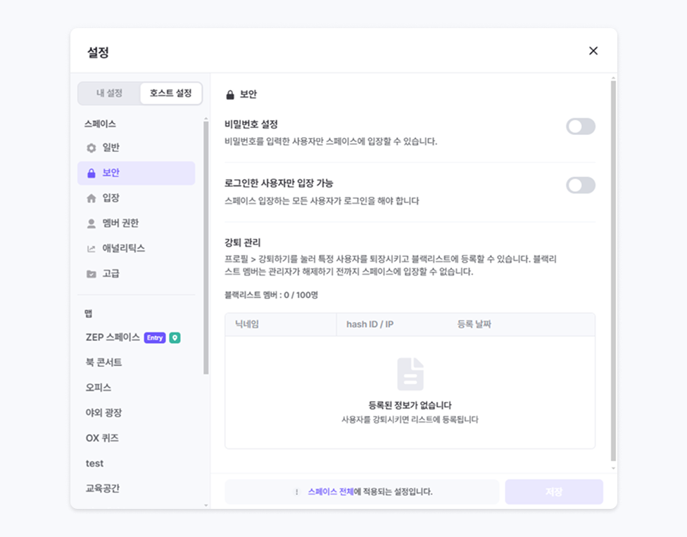 블랙리스트에 등재된 사용자는 관리자가 해제하기 전까지 스페이스에 입장할 수 없습니다.