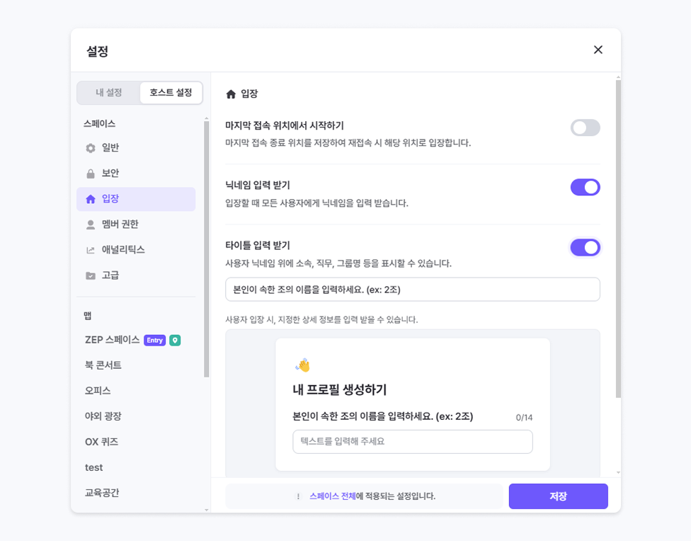 스페이스에 입장하는 모든 사용자에게 닉네임을 입력받습니다.