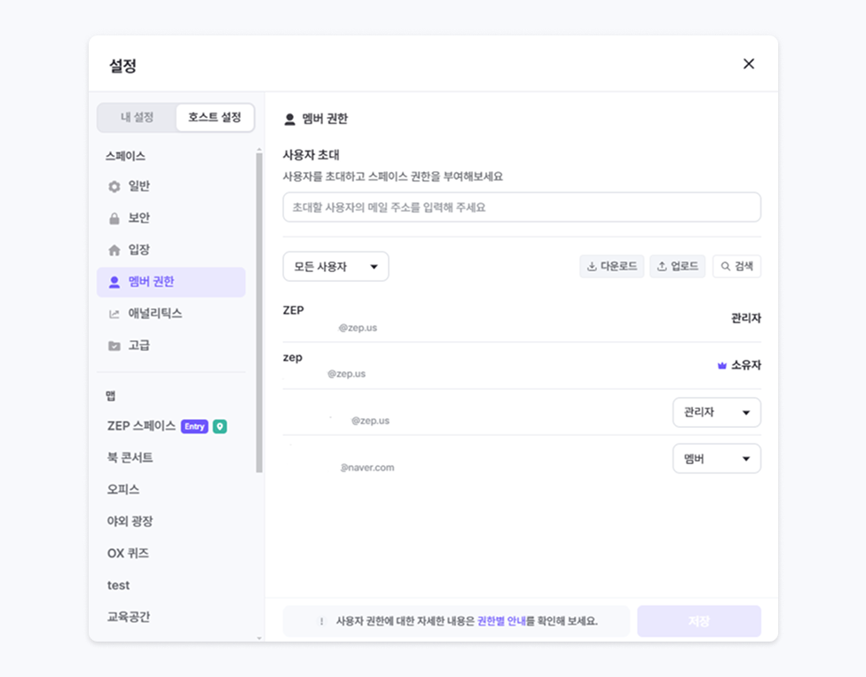 ZEP에 로그인 기록이 있는 계정에 한해 권한을 설정할 수 있습니다.멤버 초대 시, 이메일이 전송됩니다. (로그인 여부와 상관없이)이메일을 받지 못한 경우 스팸함을 확인해 주세요.소유자 권한은 한 명만 가질 수 있습니다.