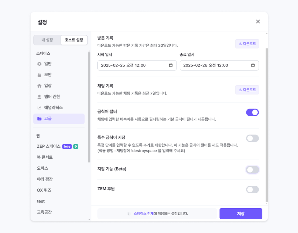 후원 기능 활성화 및 스페이스에서 발생하는 ZEM 후원의 수수료를 설정할 수 있습니다.