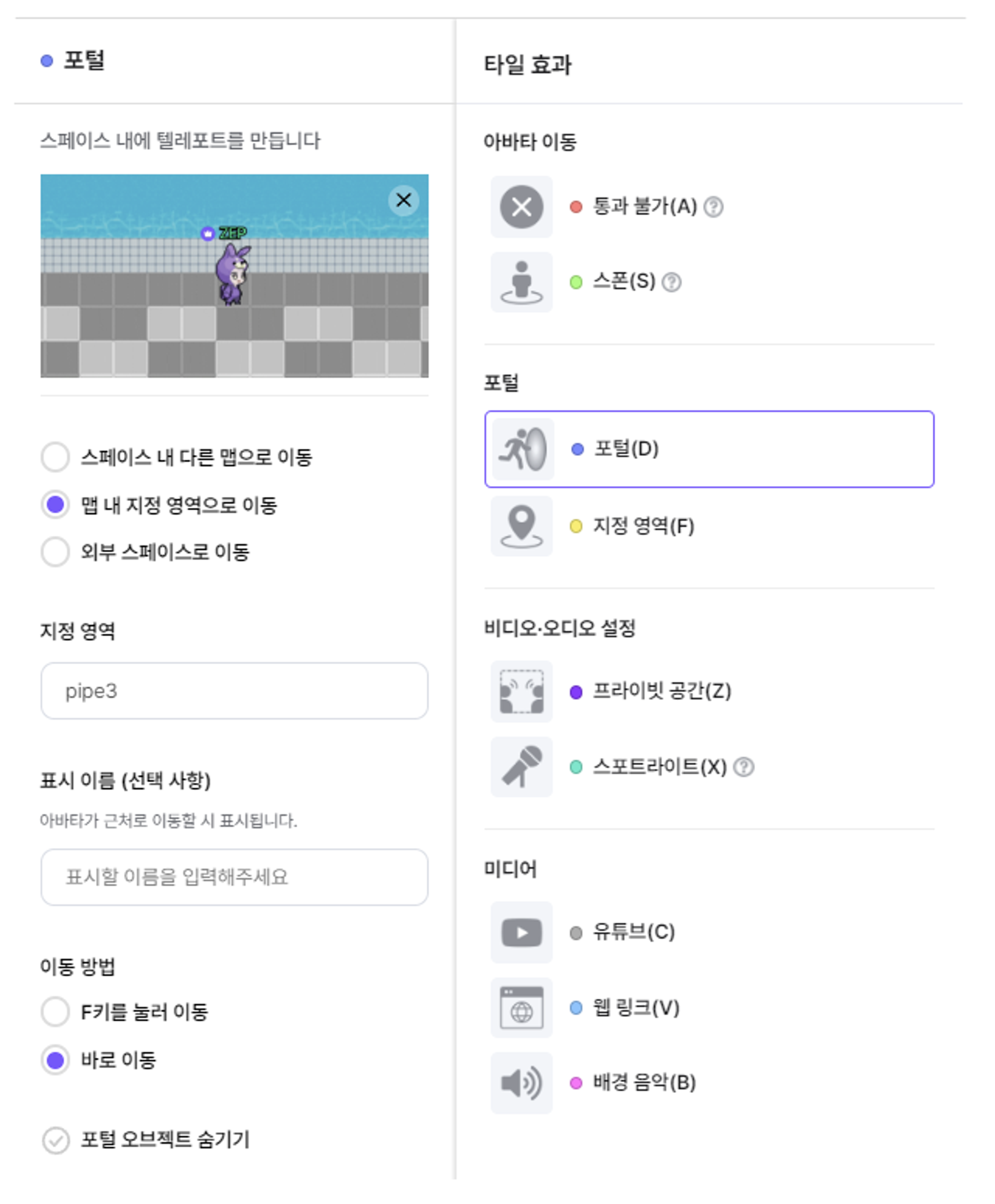 구멍 오브젝트는 포탈로 설치하고 아래와 같이 설정해주세요.
