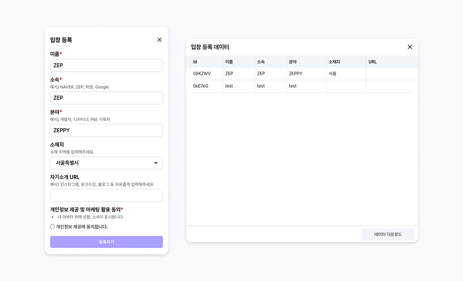 유저가 입력한 데이터는 [입장 등록 데이터] 표로 확인할 수 있습니다.