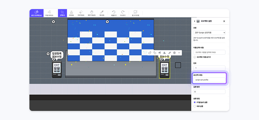 오브젝트 값이 script-set-profile 로 설정된 ZEP-Script 상호작용 오브젝트와 상호작용 시 입장 등록 정보 수정 팝업이 표시됩니다.