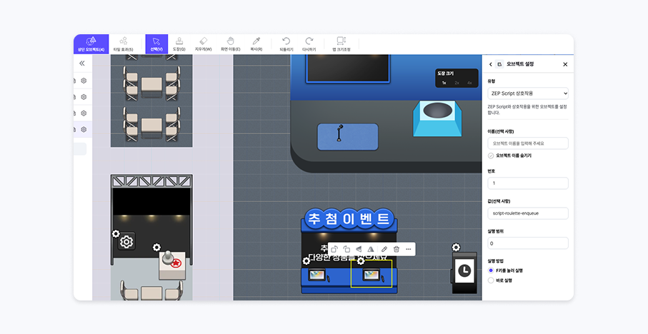 오브젝트 값은 script-inquiry_0 과 같은 형태로 설정할 수 있으며, 맨 뒤의 숫자(0~10)는 부스 번호를 나타냅니다.