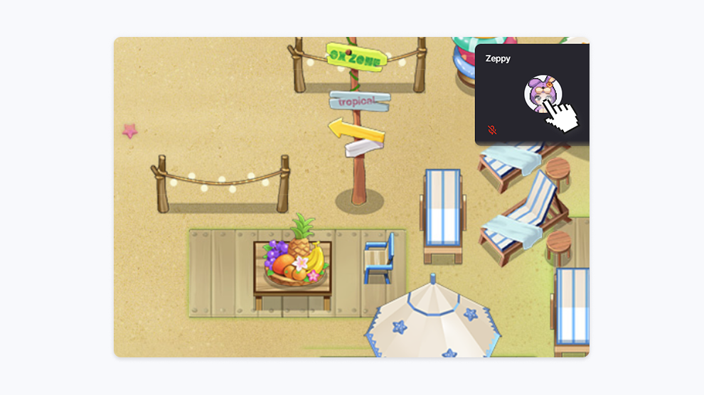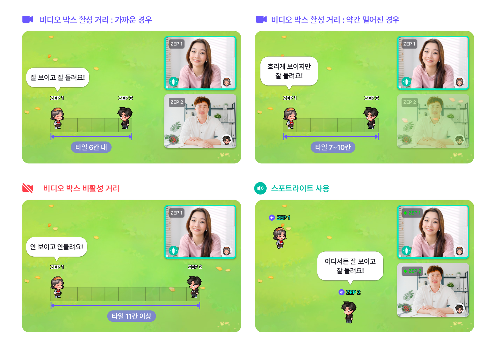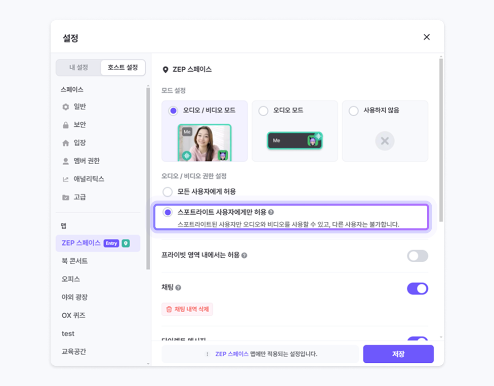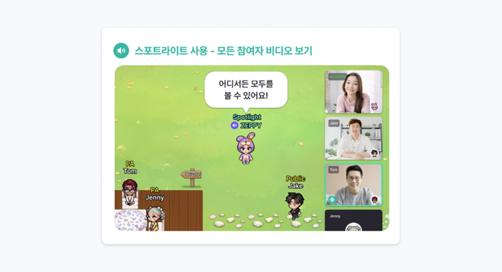 스포트라이트 사용 | 같은 맵에 있는 사용자가 스포트라이트 사용자의 비디오/오디오를 확인할 수 있어요. |