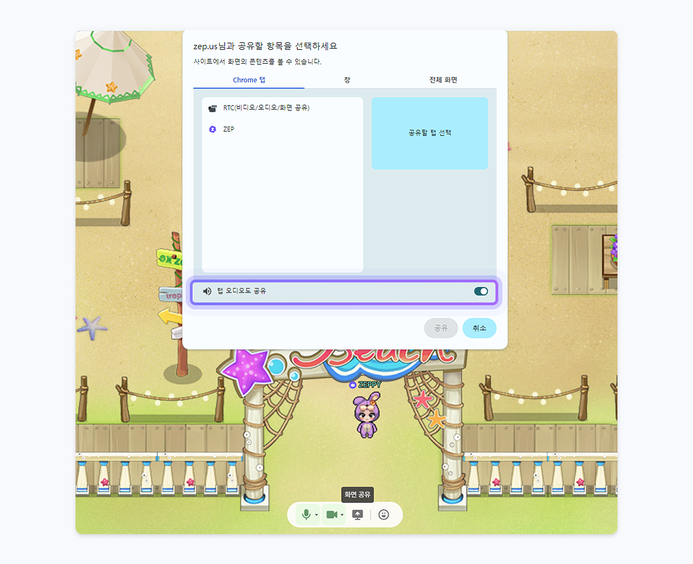 채팅창 하단에 있는 툴바에서 화면 공유 아이콘을 클릭하여 내 화면을 공유할 수 있습니다. 시스템 오디오를 공유하지 않으려면 [탭 오디오 공유,시스템 오디오 공유] 체크 박스를 한 번 더 클릭하여 비활성화 해주세요.