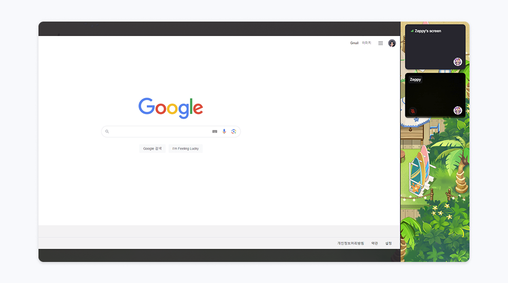 닉네임’s screen으로 추가 생성되는 비디오 박스에서 화면이 공유됩니다.기존 비디오 박스를 통해서는 자신의 비디오(카메라)/오디오(마이크)를 함께 송출할 수 있습니다.