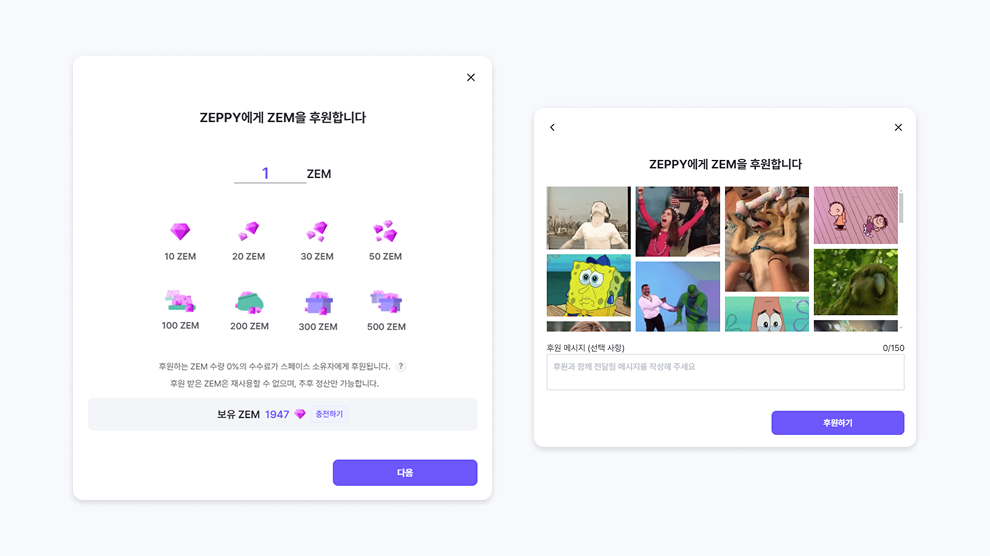 후원받은 ZEM 은 정산 가능하며, 에셋 스토어에서 사용 혹은 재후원은 불가합니다. -정산 기능은 개발 예정입니다.