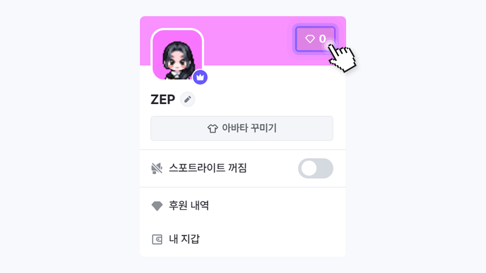 해당 기능은 [설정] → [호스트 설정] → [고급] → [ZEM 후원 버튼]에서 활성화해주셔야 프로필에서 확인하실 수 있습니다.