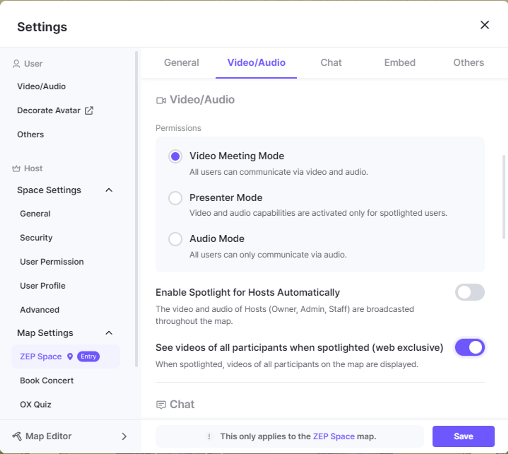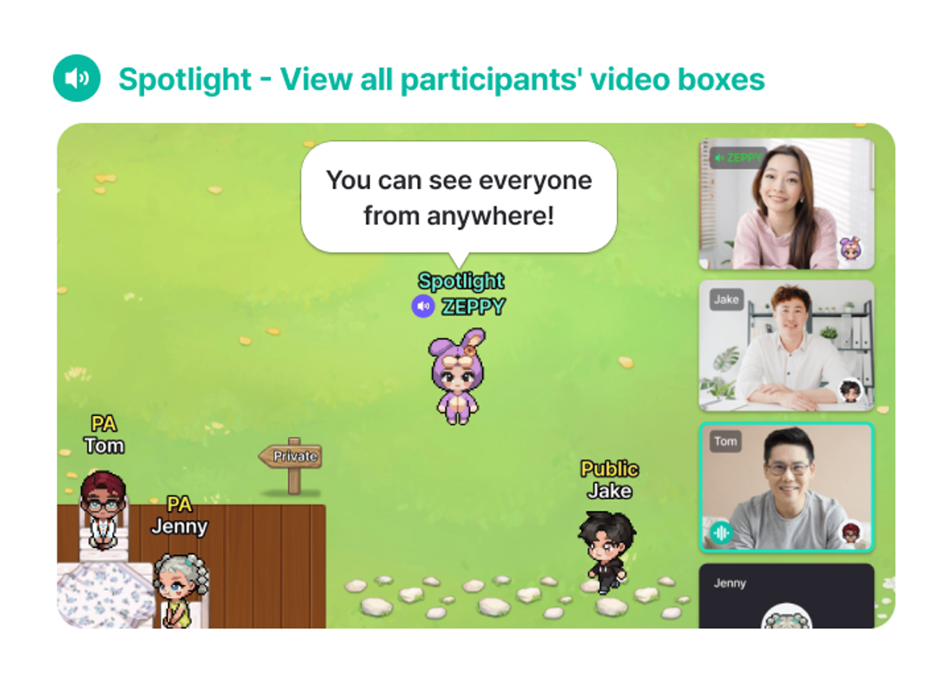 Once this feature is activated, the spotlighted user can view the video boxes of all participants in the same map.