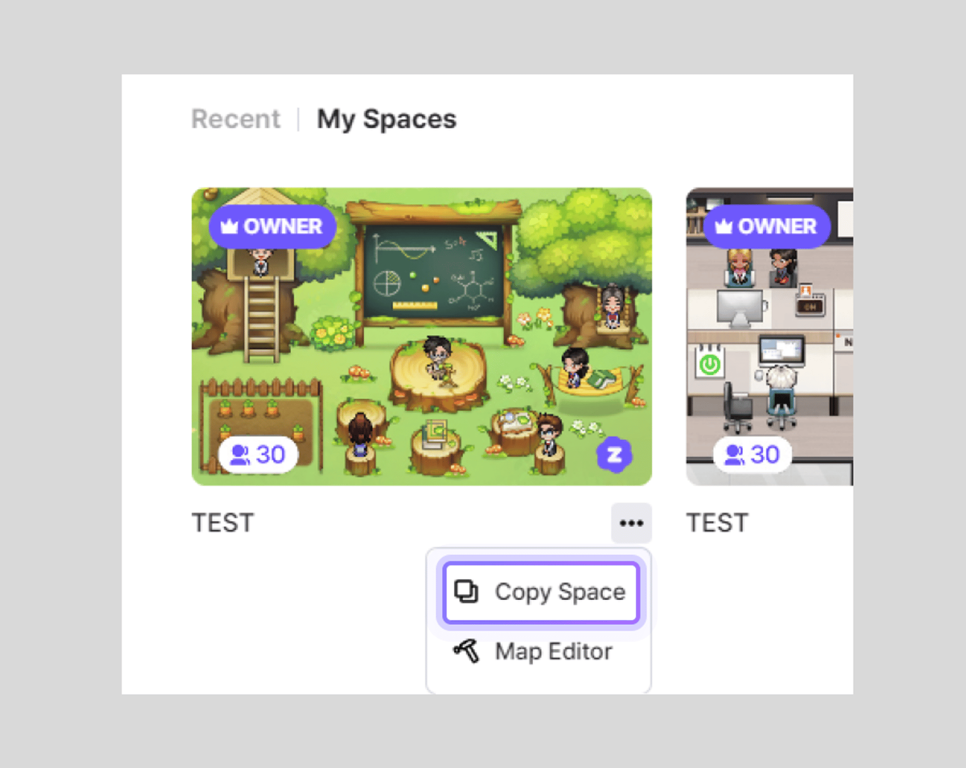 To copy my Space, click the three dots next to the Space you want to copy then click the [Copy Space] button, and the Space will be immediately copied.