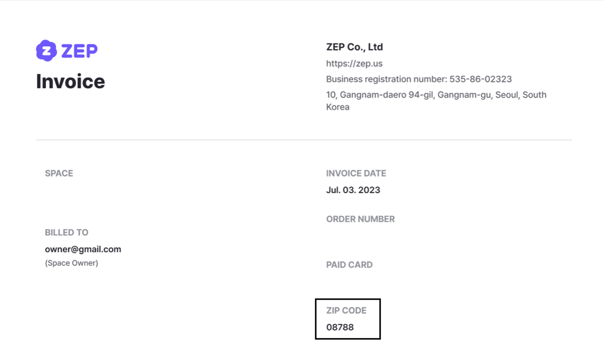 If you complete the payment with the postal code entered, the ZIP CODE will be displayed on the invoice.